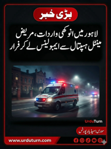 UrduTurn News www.urduturn.com WhatsApp پر فالو کریں لاہور میں ایک حیران کن اور غیر معمولی واقعہ پیش آیا جہاں ایک ذہنی مریض سرکاری ہسپتال سے ایمبولینس لے کر فرار ہو گیا۔ ذرائع کے مطابق مریض نہ صرف ایمبولینس چلانے میں کامیاب رہا بلکہ وہ سیدھا شاہدرہ کے ایک ہسپتال پہنچ گیا۔ تفصیلات کے مطابق، مذکورہ…